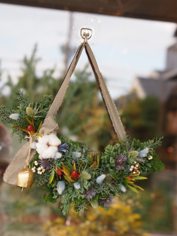 フレッシュ素材を使ったガーランド出来上がりました。まんまるリースとはまた違った可愛さがあります。
